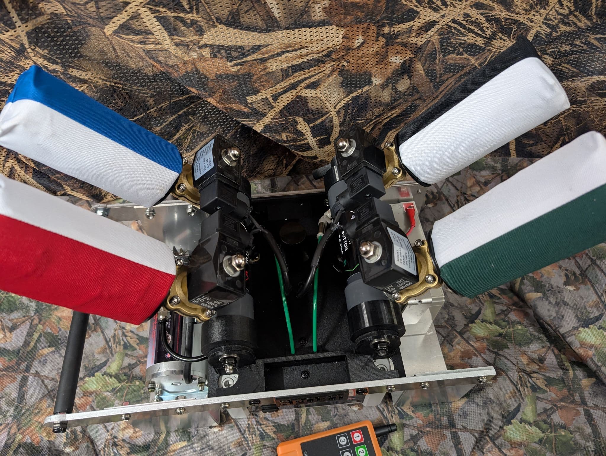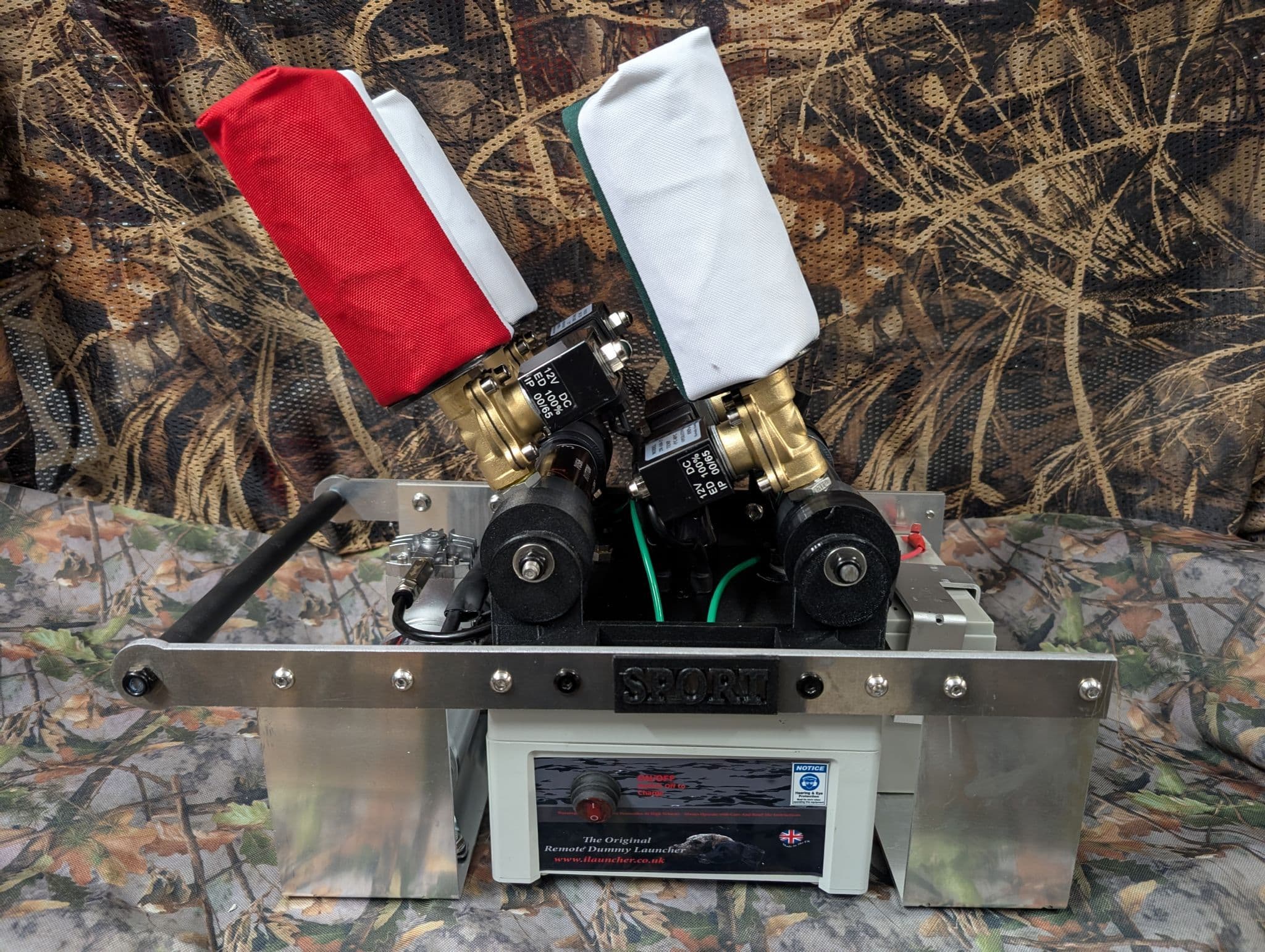 Our NEW intermediary model 4 shot SPORT . Built using a new Polythene and Carbon fiber top section. Its 10% more powerful than our previous model and weights just 10Kg in transport mode Inside it boasts LoRa radio reception and ahigh gaim PUK antenna giving line of site out to 300 meters and far better reception when hidden in cover. Improved weather resistance and softer transport handle